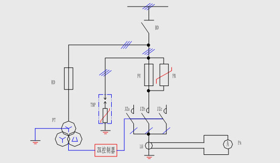 正常運行時微機控制器不斷檢測PT提供的電壓信號,一旦系統發生單相弧光接地時,真空接觸器快速動作,將不穩定的弧光接地轉化為穩定的金屬性接地。裝置輸出開關量接點信號,同時可通過RS485(或RS232)接口與微機監控系統實現數據遠傳。